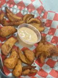 10 Juicy jalapeno poppers breaded and filled with cheese and fried to golden perfection.